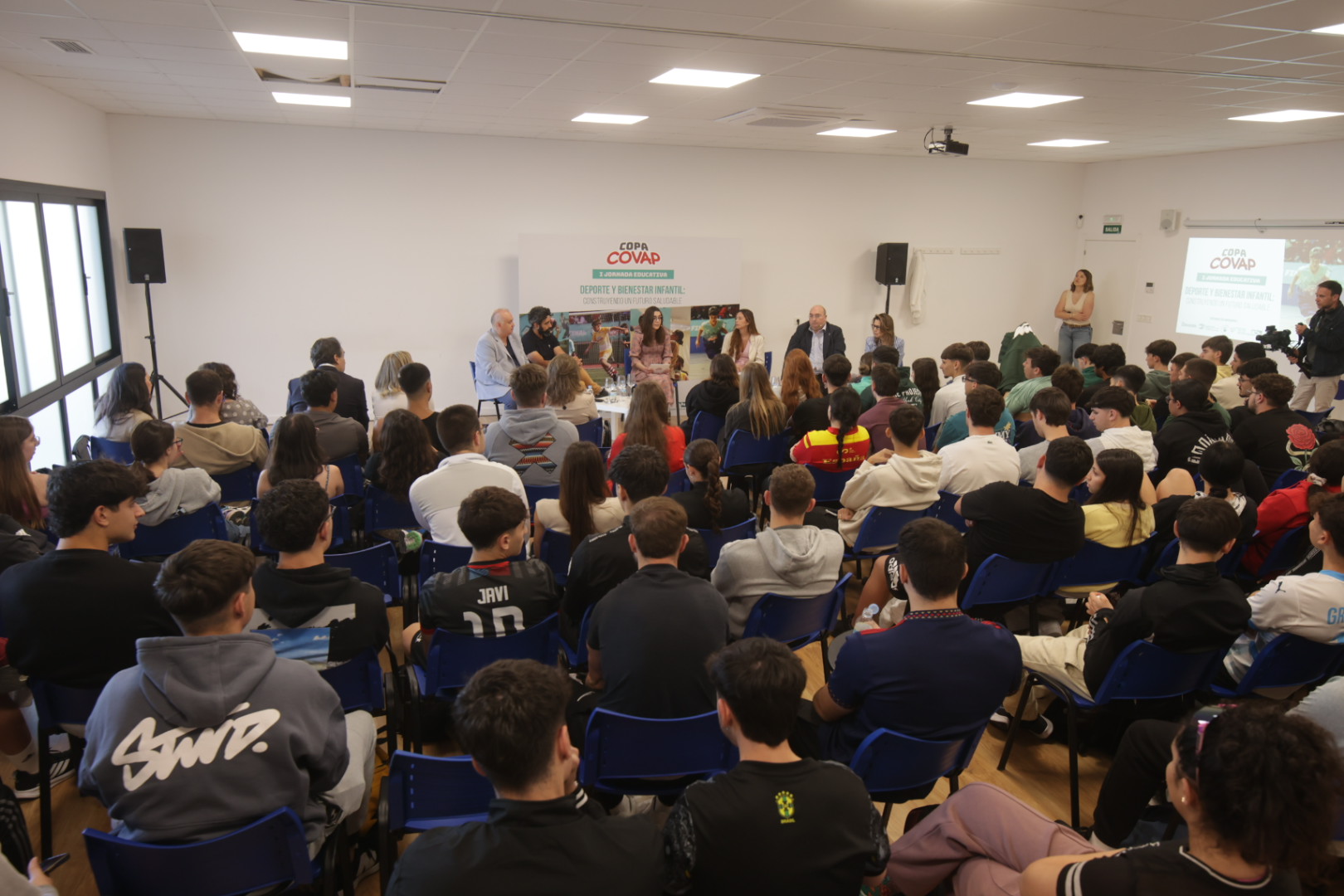 Se ha tratado de una completa jornada iniciada con una mesa redonda moderada por Manuela Pozuelo, responsable del proyecto de la Copa COVAP, que ha contado con la participación de Nuria Martínez, directora de la Asociación 5 Al Día; Antonio Luis Mora, vocal de Sevilla del Colegio de Podólogos de Andalucía (COPOAN); Almudena Hierro, optometrista colegiada del Colegio de Ópticos-Optometristas de Andalucía (COOOA); David Peris, presidente de la FEPD (Federación Española de Psicología del Deporte); y Julio Gómez, jefe de estudios de la rama de Deporte del centro de formación que acoge este acto. Durante el debate, se han abordado claves para fomentar un desarrollo saludable en la infancia desde múltiples disciplinas: la nutrición, la salud visual, el cuidado postural y el bienestar psicológico.