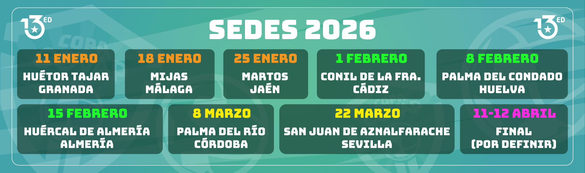El calendario de la 13ª Copa COVAP recorrerá las 8 provincias andaluzas en los tres primeros meses de 2026, arrancando el 11 de enero en Huétor Tájar (Granada) y continuando el 18 y 25 de enero en Mijas (Málaga) y Martos (Jaén). El 1 de febrero se celebrará en Conil de la Frontera (Cádiz), y el 8 y 15 en La Palma del Condado (Huelva) y Huércal de Almería. El 8 de marzo visitará Palma del Río (Córdoba) y el 22 San Juan de Aznalfarache (Sevilla). La final será el 11 y 12 de abril en una localidad por confirmar.