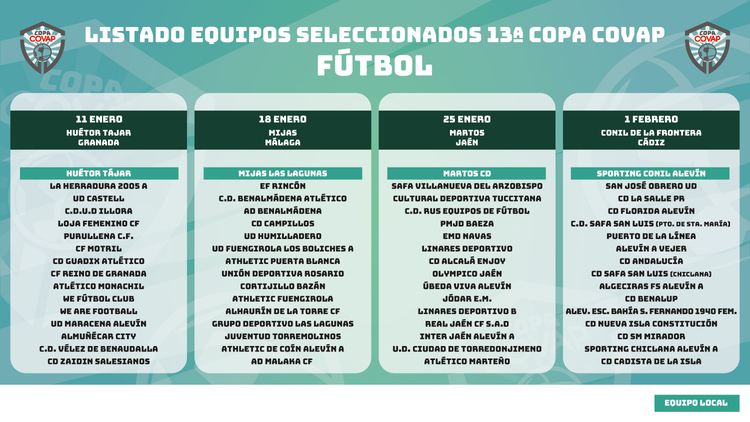 ¡Tras realizar el recuento de votos entre los equipos participantes de nuestro concurso por el que sorteábamos la última plaza de cada categoría… así queda finalmente el cuadro definitivo de equipos participantes de la 13ª Copa COVAP para las sedes de Granada, Málaga, Jaén y Cádiz!