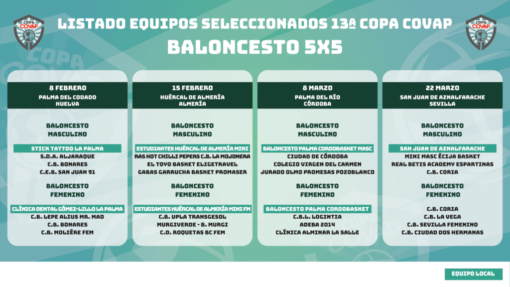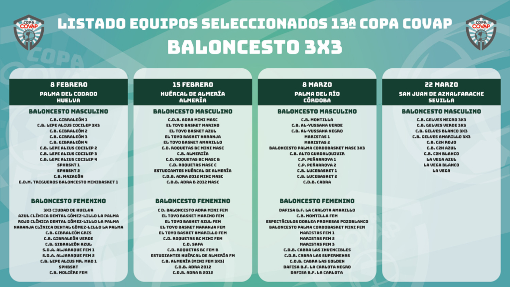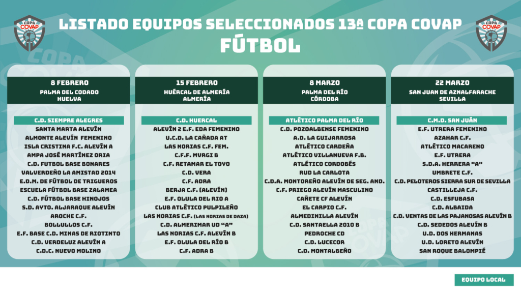 ¡Tras realizar el recuento de votos entre los equipos participantes de nuestro concurso por el que sorteábamos la última plaza de cada categoría… así queda finalmente el cuadro definitivo de equipos participantes de la 13ª Copa COVAP para las sedes de Huelva, Almería, Córdoba y Sevilla!