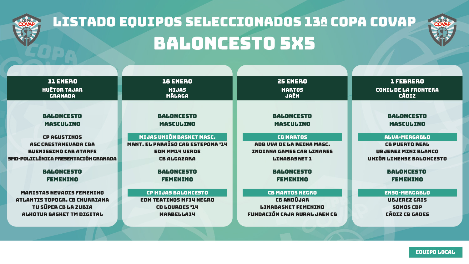 ¡Os dejamos con el listado definitivo de equipos seleccionados para disputar la 13ª edición de la Copa COVAP! Una aventura que marca su inicio el próximo domingo, 11 de enero, en la localidad granadina de Huétor Tájar, y que impulsará a través de toda la geografía andaluza hábitos saludables como el deporte y la alimentación sana y equilibrada para conseguir esos superpoderes que nos hacen únicos. ¡Muchas gracias a todos los equipos por su implicación y participación! ¡Os esperamos próximamente en cada sede provincial!